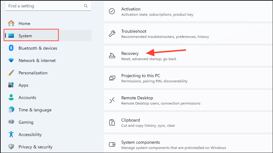 - Open the Settings app, click on 'System' on the left, and then on 'Recovery'.
