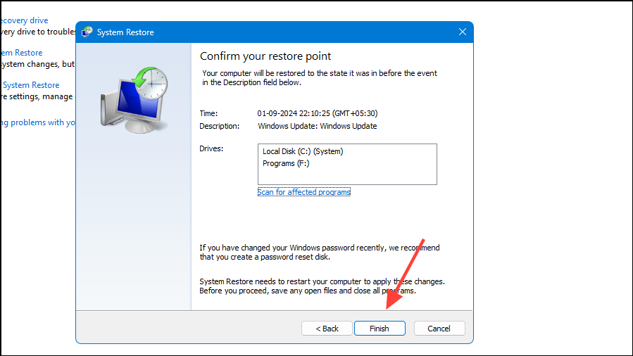 - Lastly, click on the 'Finish' button and your computer will reboot and restore itself to the restore point you selected.