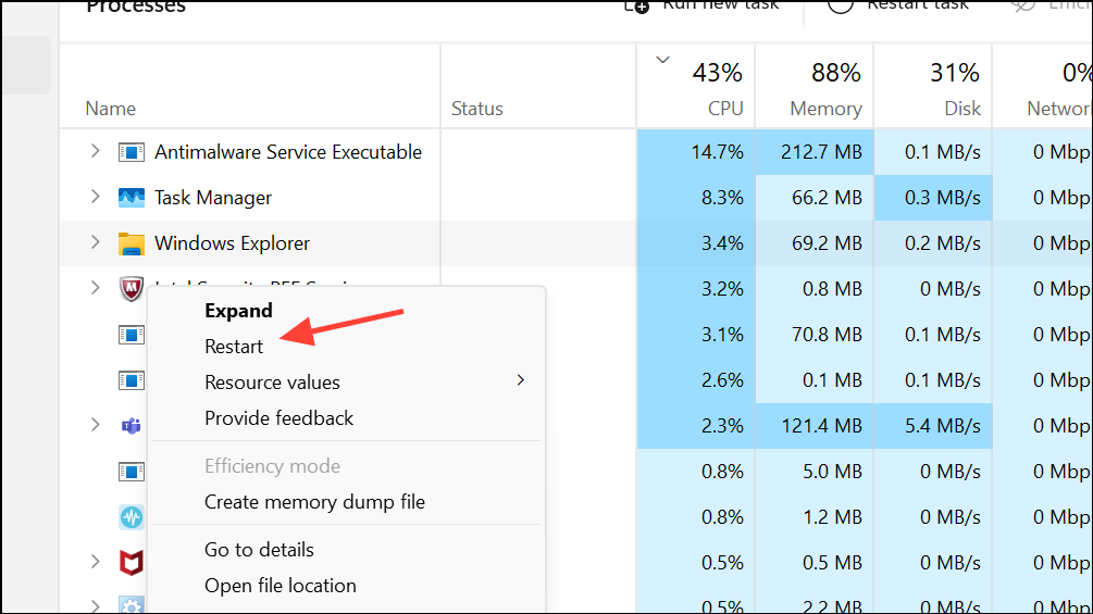 Step 2: In Task Manager, look for "Windows Explorer" in the list of processes. Right-click it and choose Restart.