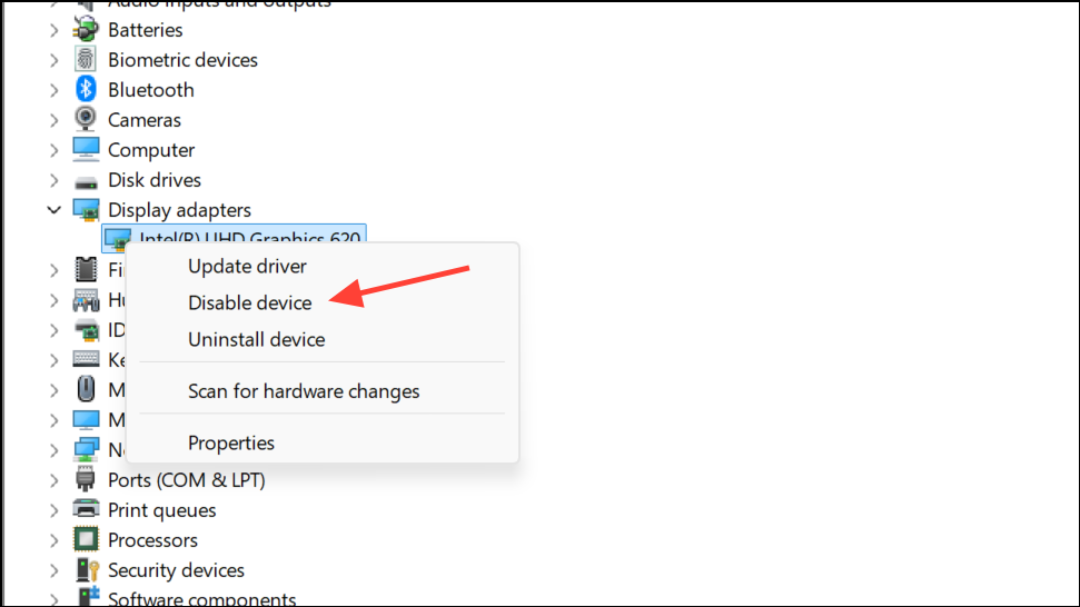 Step 4: If neither option works, you can also select Disable device to force Windows to use basic display drivers, which may restore basic functionality for further troubleshooting.