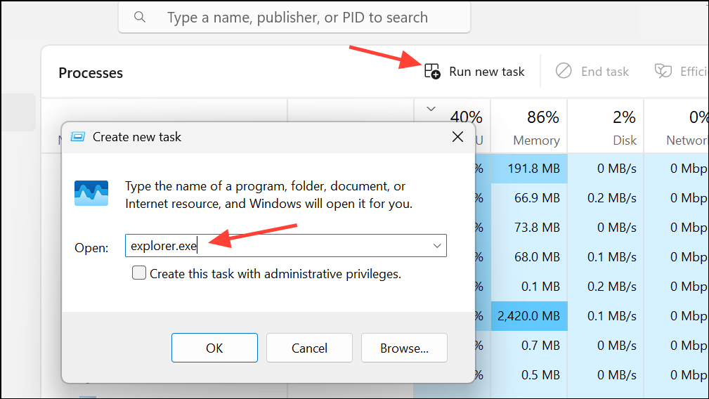 Step 3: If Windows Explorer is not listed, click File > Run new task, type explorer.exe, and press Enter. This process reloads the user interface, which often resolves a black screen caused by a failed startup of the desktop environment.