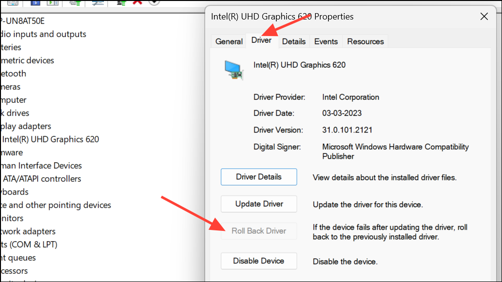 Step 3: If the black screen began after a recent update, choose Properties > Driver tab > Roll Back Driver to revert to the previous version.