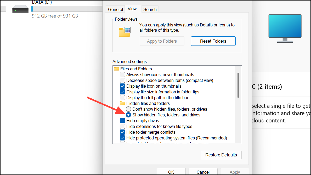 Step 1: Open File Explorer and click the three-dot menu on the toolbar, then select "Options". In the Folder Options window, go to the "View" tab and select "Show hidden files, folders, and drives". Click "OK" to apply the change.