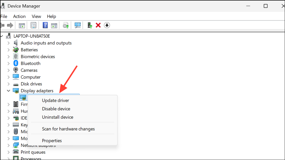 Step 2: Right-click your graphics card and choose "Update driver". Select "Search automatically for drivers" and follow the prompts. If no updates are found, you can choose "Uninstall device" and restart your PC; Windows will reinstall the default driver on reboot.