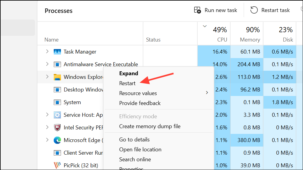 Step 2: If that doesn't work, press Ctrl + Shift + Esc to open Task Manager. Scroll down to "Windows Explorer", right-click it, and select "Restart". This restarts the file management interface, often restoring icons immediately.