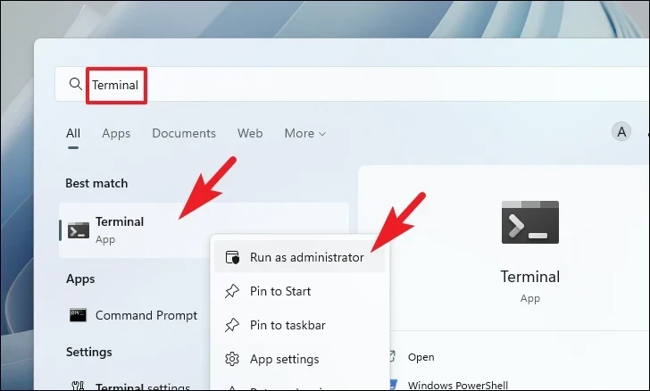 Step 1: Open the Start Menu and type Terminal. Right-click on the Terminal app and select Run as administrator.