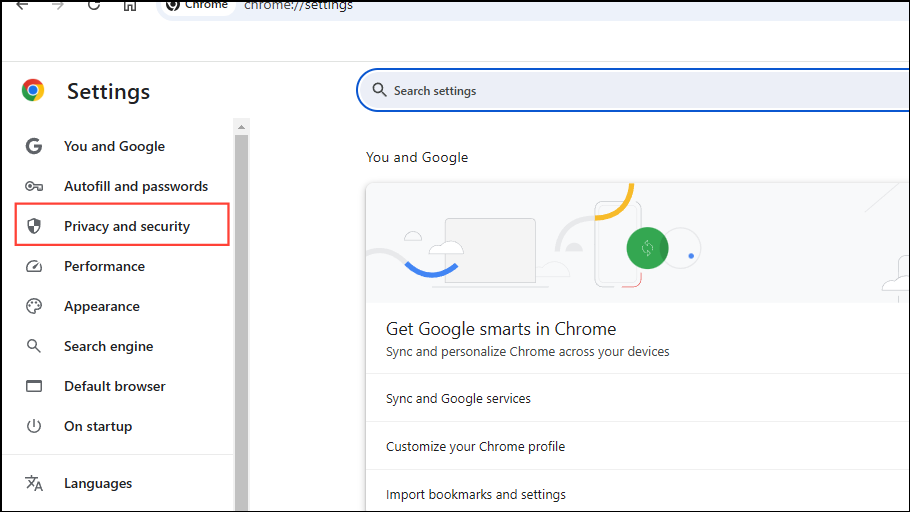 - Once the Settings page opens, click on 'Privacy and security' on the left.