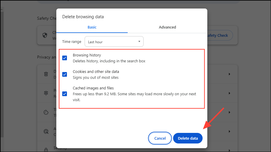 - Now, click on the 'Browsing history' and 'Cached cookies and files' checkboxes in the pop-up to select them before clicking on the 'Delete data' button. You can also select the time range for which you want to clear the data using the Time Range dropdown at the top.