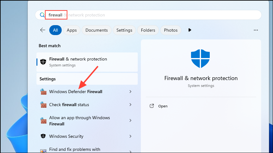 firewalland click on 'Windows Defender Firewall'.