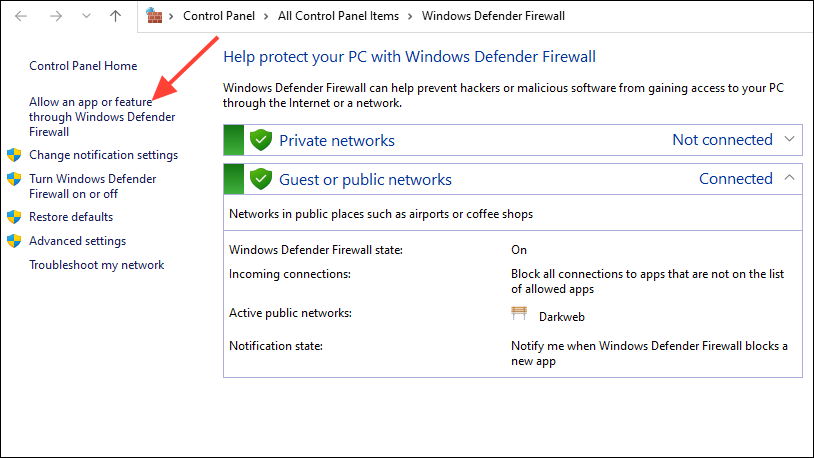 - When the Windows Defender Firewall window opens, click on 'Allow an app or feature through Windows Defender Firewall'.