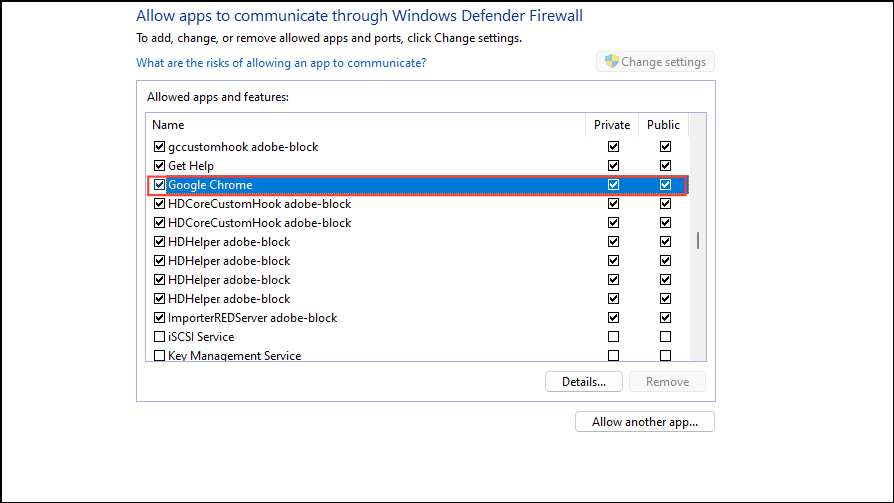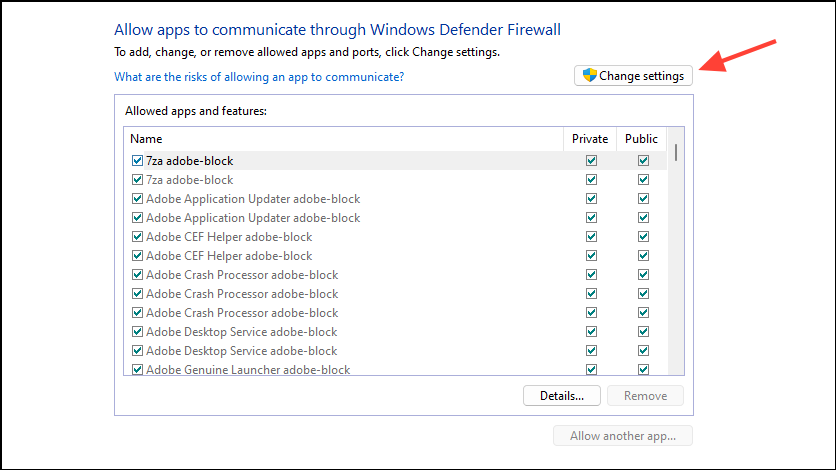 - Now you will see a list of programs that are allowed through the firewall. Scroll through it and check whether your browser is allowed to access the network. If it isn't, click on the 'Change settings' button at the top.