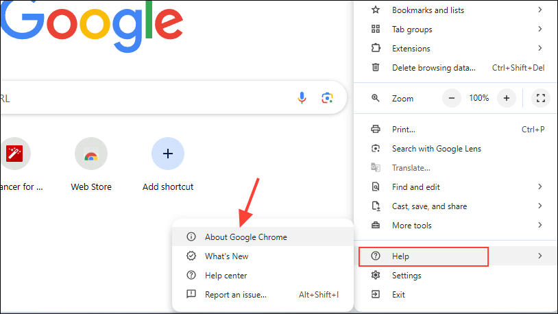 - In Chrome, click on the three dots on the top right and go to 'Help', before clicking on 'About Google Chrome'.