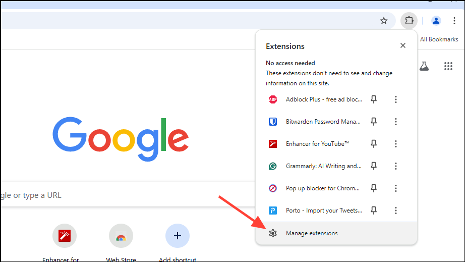 - Then click on 'Manage extensions' in the dropdown menu.