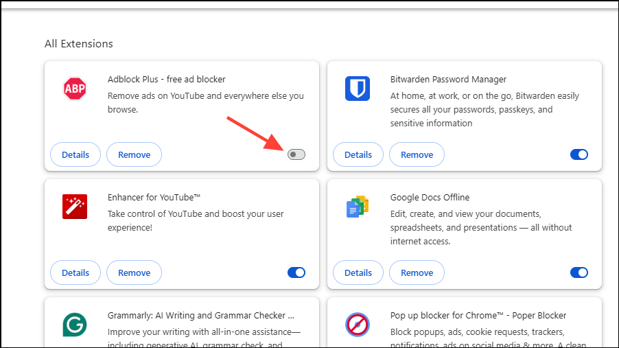 - On the Extensions page, click on the toggle for your ad blocker or extension you want to disable to turn it off. Then check whether you can access Bluesky.