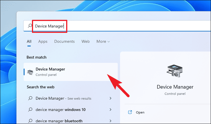 Device Managerby clicking on the Start Menu and typingDevice Manager, then selecting it from the search results.