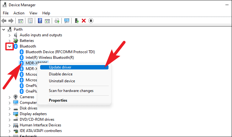 Bluetoothsection by clicking on the small arrow next to it. - Right-click on the Bluetooth device for which you want to update the driver, and select