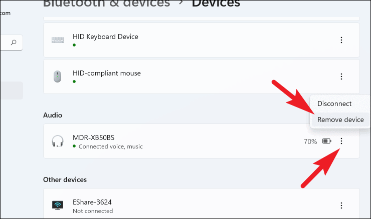 - Locate your Bluetooth device, click on the three-dot menu (kebab icon) next to it, and select Remove.