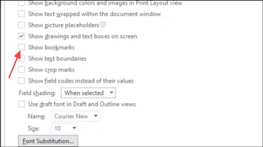 Step 3: Check the box labeled Show bookmarks and click OK. Brackets will now appear around bookmarked text or objects, and I-beams will indicate cursor-based bookmarks. This visual cue allows you to quickly spot missing or misplaced bookmarks.