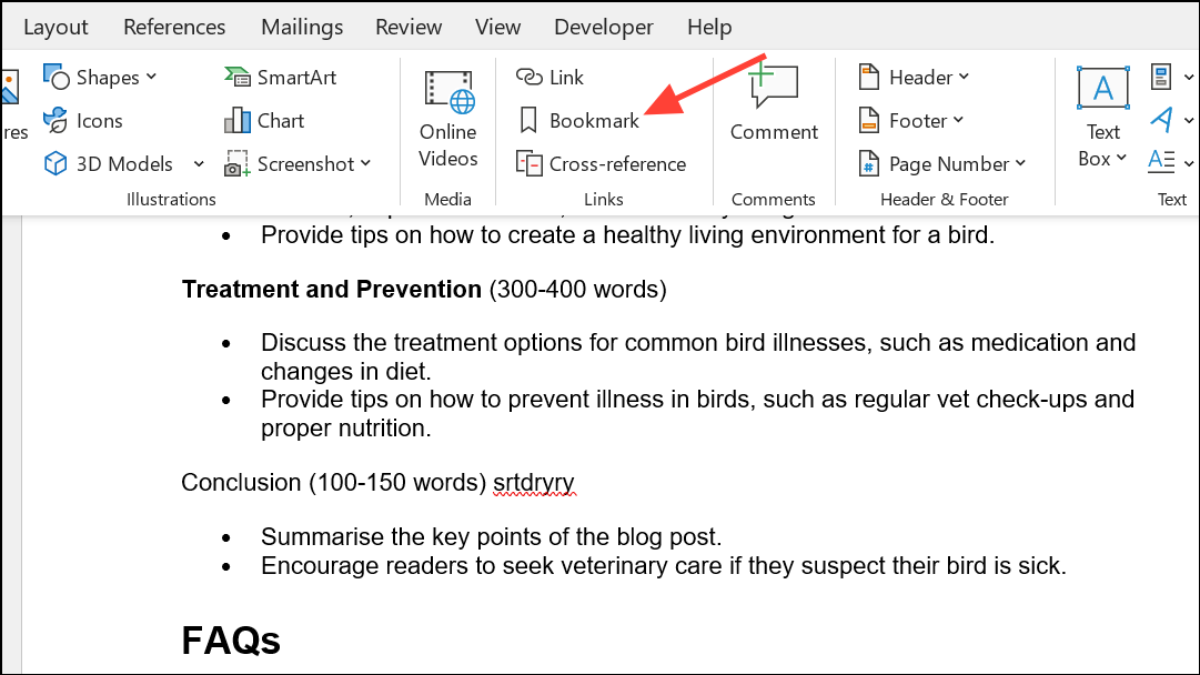 Step 3: Select Insert > Links > Bookmark from the ribbon. In the dialog, enter the exact name displayed in the field code and click Add to recreate the bookmark.
