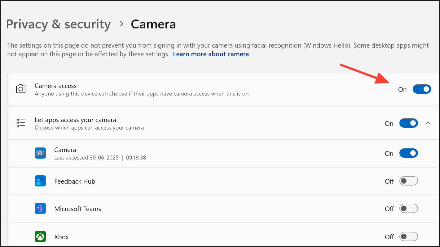 Step 2: Click on Camera under the “App permissions” section. Ensure that Camera access is turned on for your device. If the option is greyed out, you may need administrator rights to enable it.
