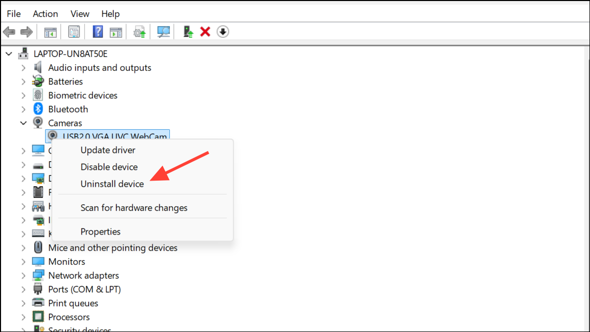 Step 4: If updating does not resolve the issue, right-click the camera again and select Uninstall device. Confirm the uninstallation and restart your computer. Windows will attempt to reinstall the default driver upon reboot, restoring camera functionality.