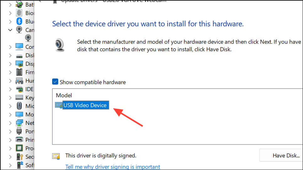 Step 6: Choose USB Video Device and complete the update. This step forces Windows to use its generic camera driver, which can resolve compatibility problems.