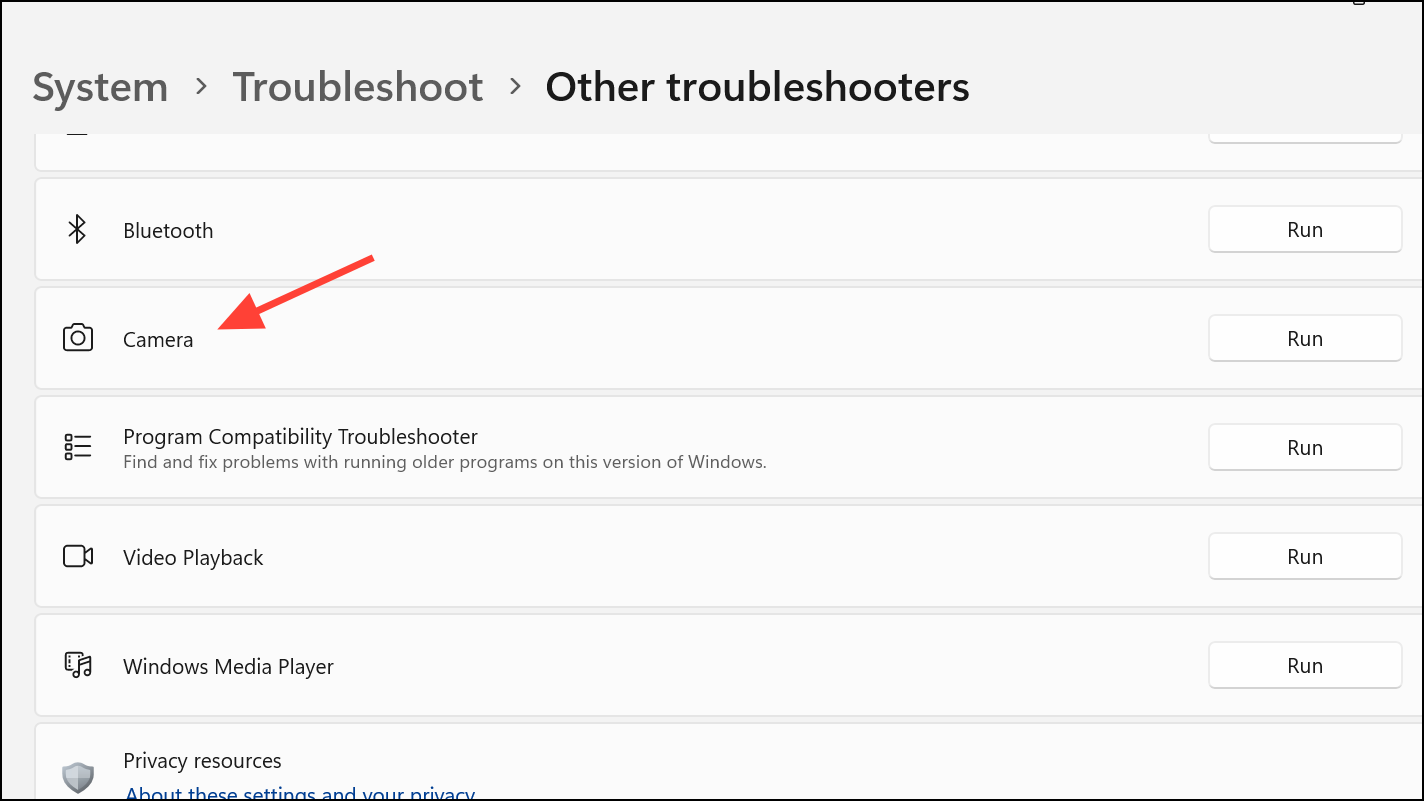 Step 2: Scroll down to the Camera section and click Run. The troubleshooter will scan for common issues and attempt to fix them automatically, including permission errors and service conflicts.