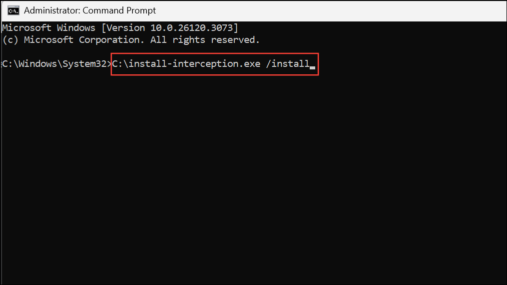 Step 5: For the "Interception Error" on PC, locate install-interception.exe on your system drive. Open Command Prompt as administrator and run the following commands: