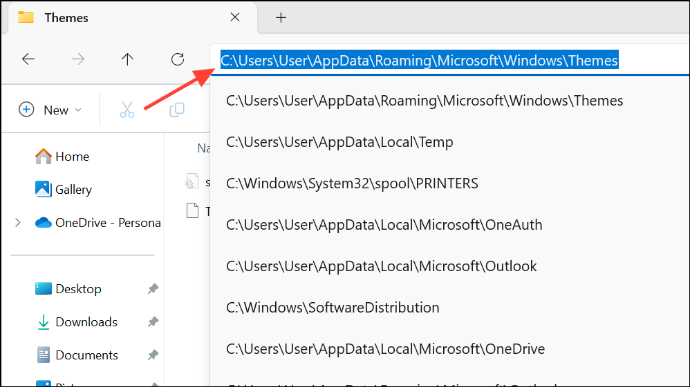 Step 1: Open File Explorer and reveal hidden items by clicking the “View” tab and checking Hidden items. Navigate to %APPDATA%\Microsoft\Windows\Themes by pasting it into the address bar and pressing Enter.