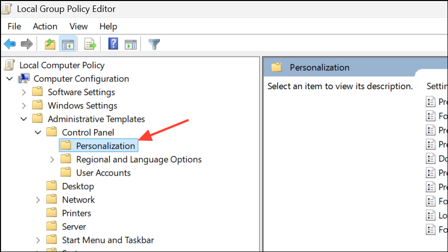 Step 2: In the left pane, navigate to User Configuration > Administrative Templates > Control Panel > Personalization.