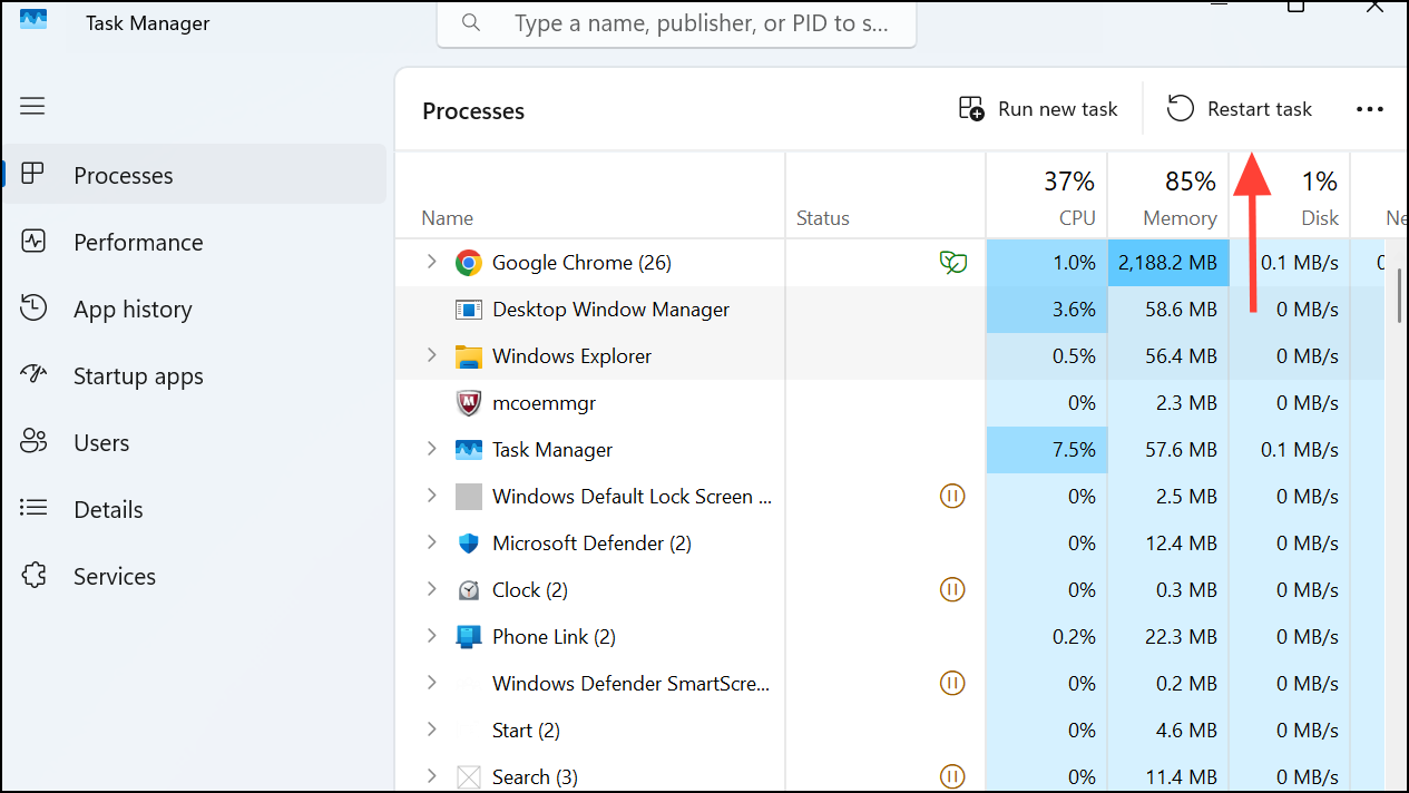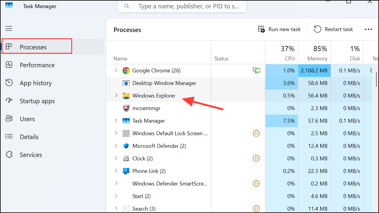 Step 2: In the Task Manager window, scroll down under the "Processes" tab and locate "Windows Explorer." Click on it once to select it.