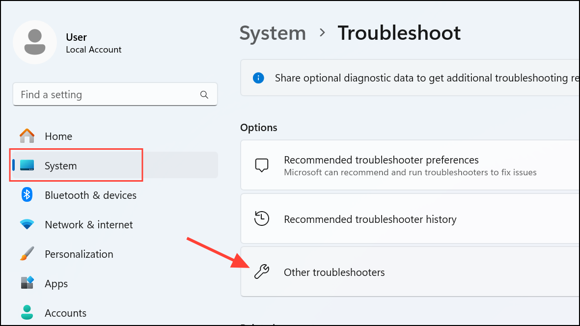Step 2: In the Settings window, select "System" from the sidebar, then click "Troubleshoot" and select "Other troubleshooters."