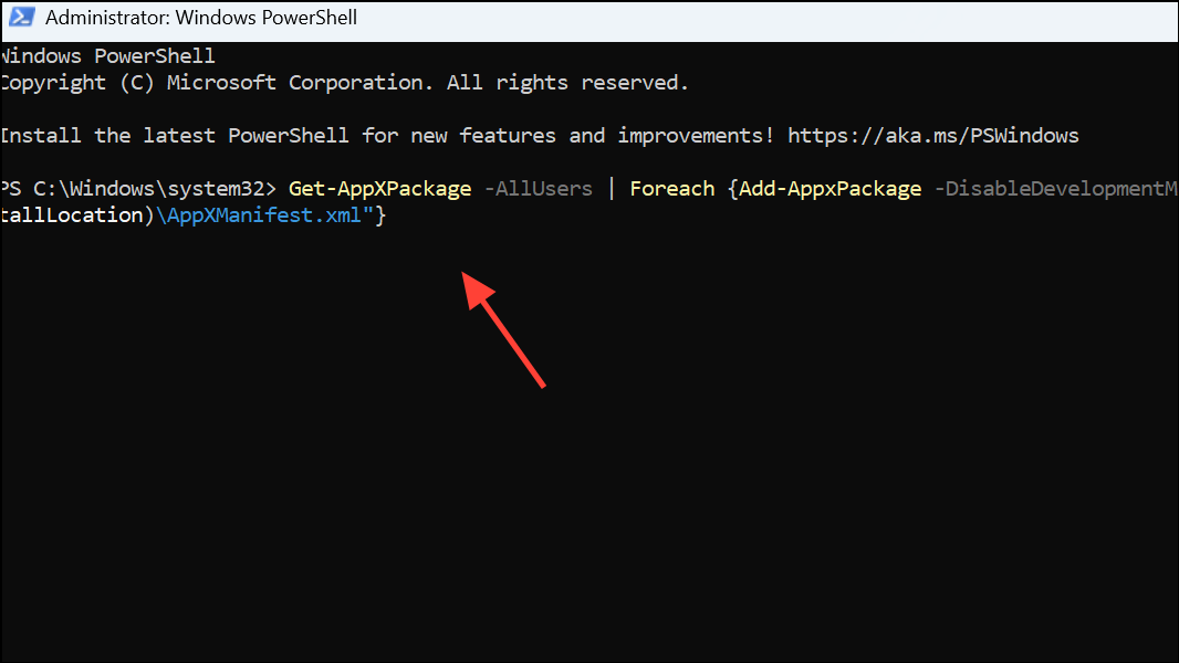 Step 2: To repair potential corruption or misconfiguration of taskbar components, copy and paste the following command into the PowerShell window, then press Enter:
