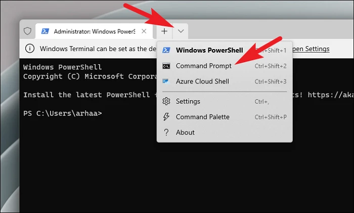 Once the terminal window opens, click the chevron (downward arrow) and select the 'Command Prompt' option to open a CMD shell.