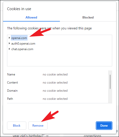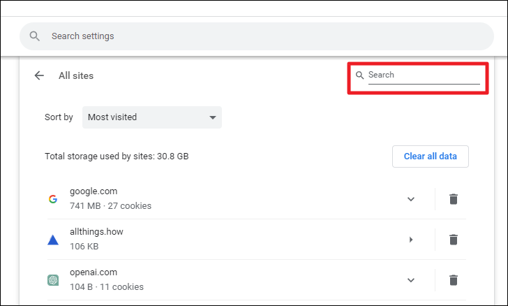 On the next screen, you can either scroll manually or use the 'Search' field in the top right corner to locate 'ChatGPT' cookies. Simply type openai.com in the search box.