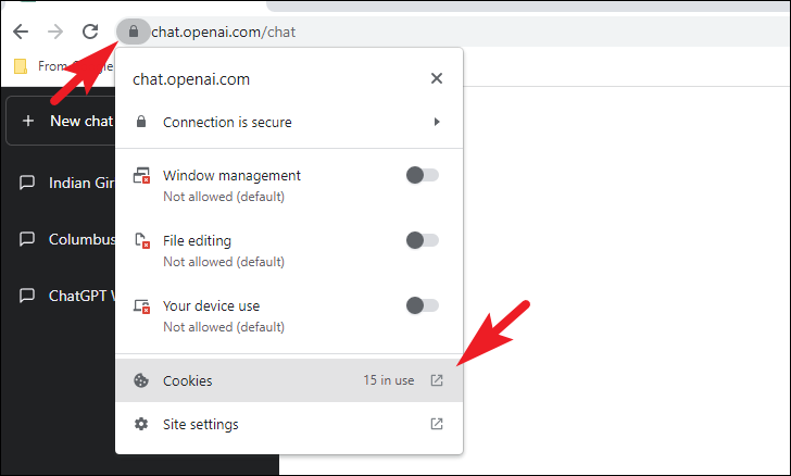 Head to chat.openai.com using your preferred browser. Then, click on the 'Lock' icon on the address bar. Next, click the 'Cookies' option, which will bring an overlay window to your screen.