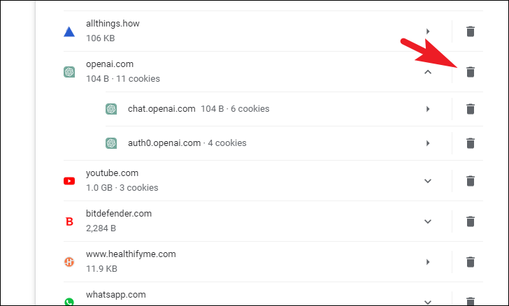 Once you have located the cookies, click on the 'Trash bin' icon next to it, and all cookies will be deleted.