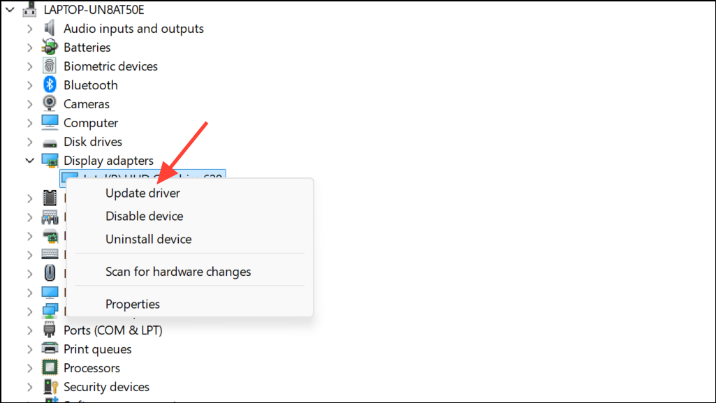 Step 2: Expand the Display adapters section. Right-click your graphics device (such as Intel HD Graphics or NVIDIA/AMD GPU) and select Update driver.