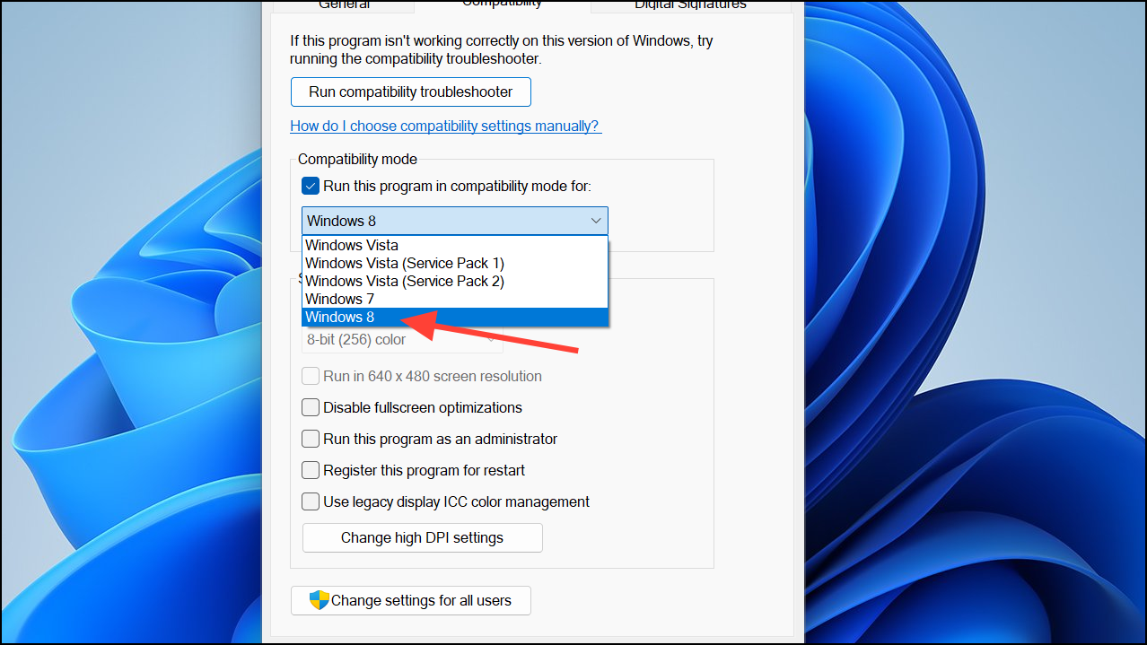 Step 4: Go to the Compatibility tab. Check Run this program in compatibility mode for: and select Windows 7 or Windows 8 from the dropdown menu.