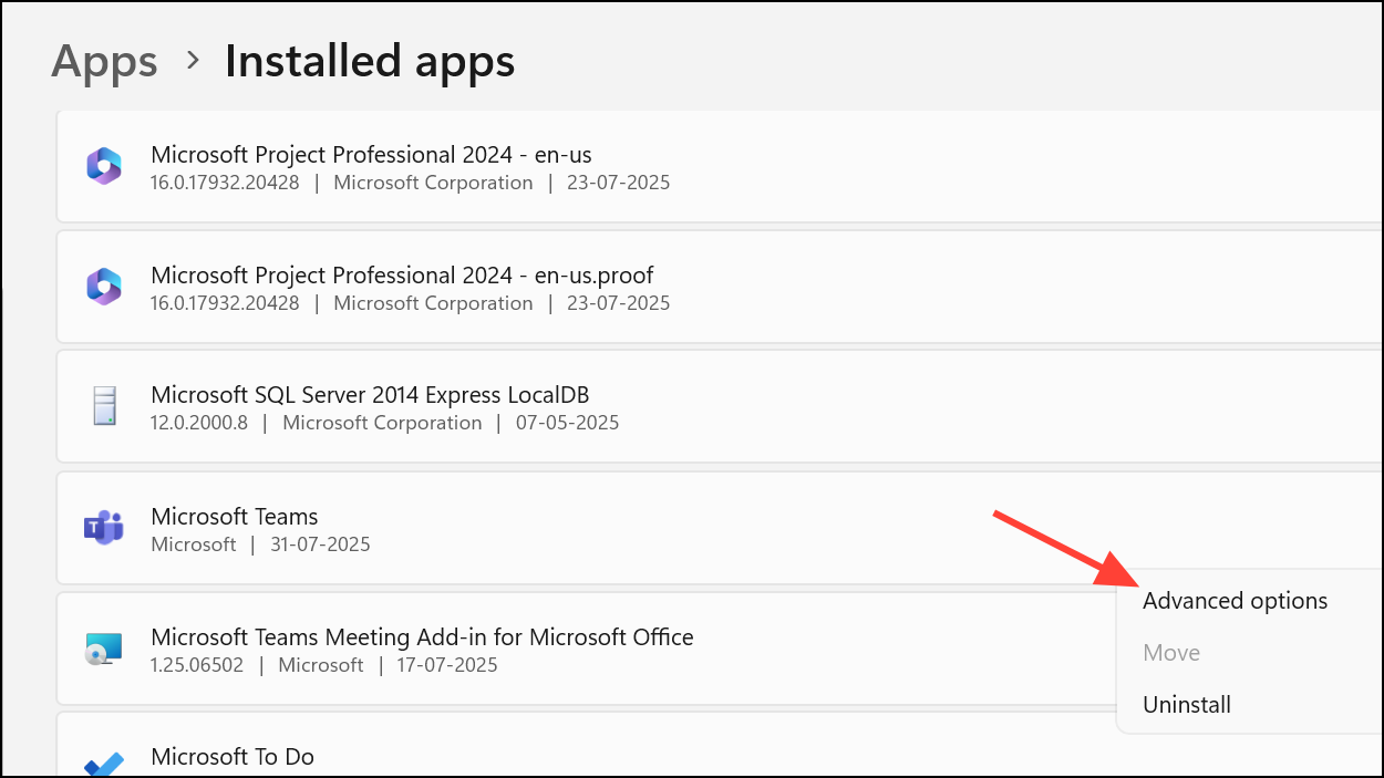 Step 2: Find Microsoft Teams in the list. Click the three-dot menu and select Advanced options (if available), then click Repair or Reset.
