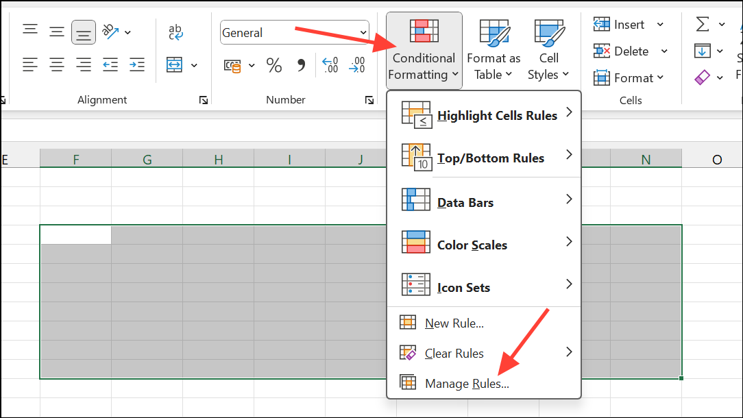 Step 1: Open the Conditional Formatting Rules Manager by selecting your formatted range, then navigating to the Home tab and clicking "Conditional Formatting" > "Manage Rules".