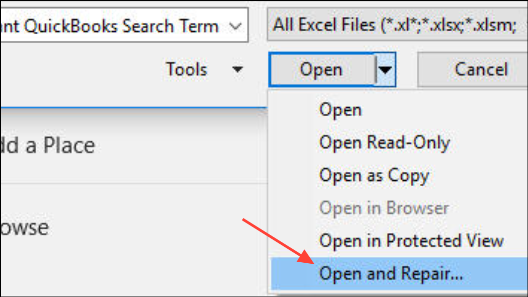 Step 2: Reopen Excel, go to File > Open, select your file, and choose "Open and Repair" from the dropdown next to the Open button.