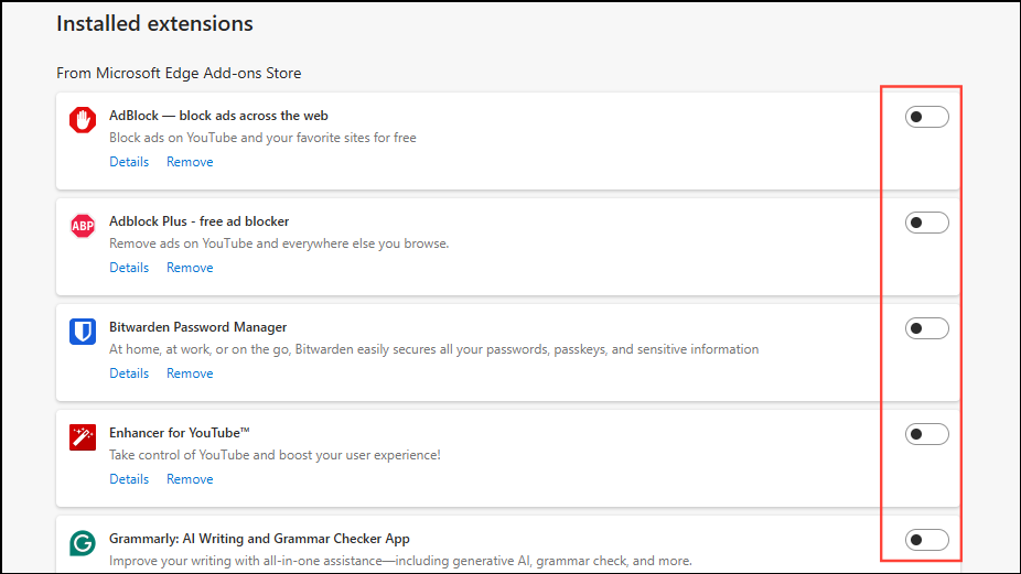 Extensions can sometimes conflict with Copilot. Disabling them can help identify if one of them is causing the issue.
