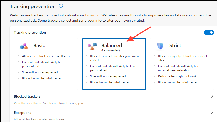Edge's Tracking Prevention feature can block certain web components, potentially affecting Copilot. Adjusting this setting may help.
