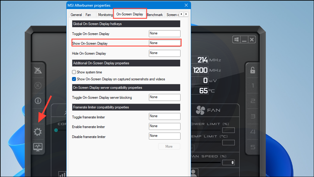Step 2: Once the program is installed, open it and click the gear icon on the left. In the pop-up that appears, click the 'On-Screen Display' tab at the top and set a hotkey for enabling it. You can then turn it on in the middle of your game to monitor the CPU and GPU.