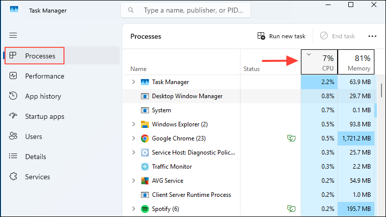 Step 1: Press Ctrl + Shift + Esc to open Task Manager. Go to the "Processes" tab and sort the list by CPU usage by clicking the CPU section.