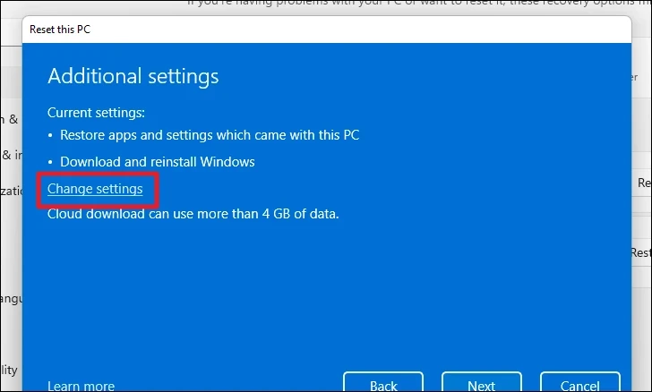 Step 6: Select Cloud download to reinstall Windows from the cloud. Note that this requires an internet connection and will use over 4 GB of data.
