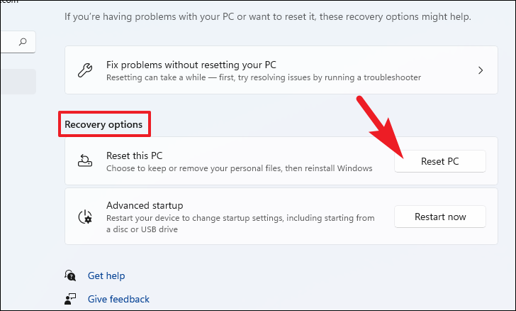 Step 4: Under the Recovery options section, click on Reset PC next to Reset this PC.