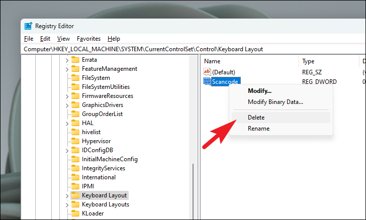 Step 4: In the right pane, locate the Scancode Map entry. Right-click on it and select Delete.