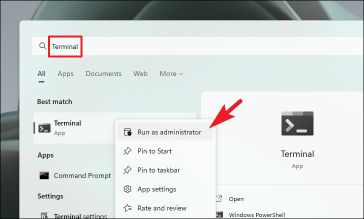 Step 1: Open the Start menu, type Terminal, right-click on the app, and select Run as administrator.